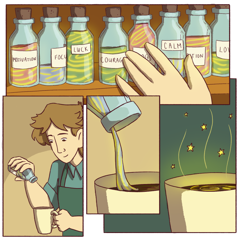 ‘Step into a world where a little bit of magic water in your coffee helps you through the day. Follow Dara and her best friend Michael in their quest to uncover the secrets behind the magical water and monopoly government has on it.‘